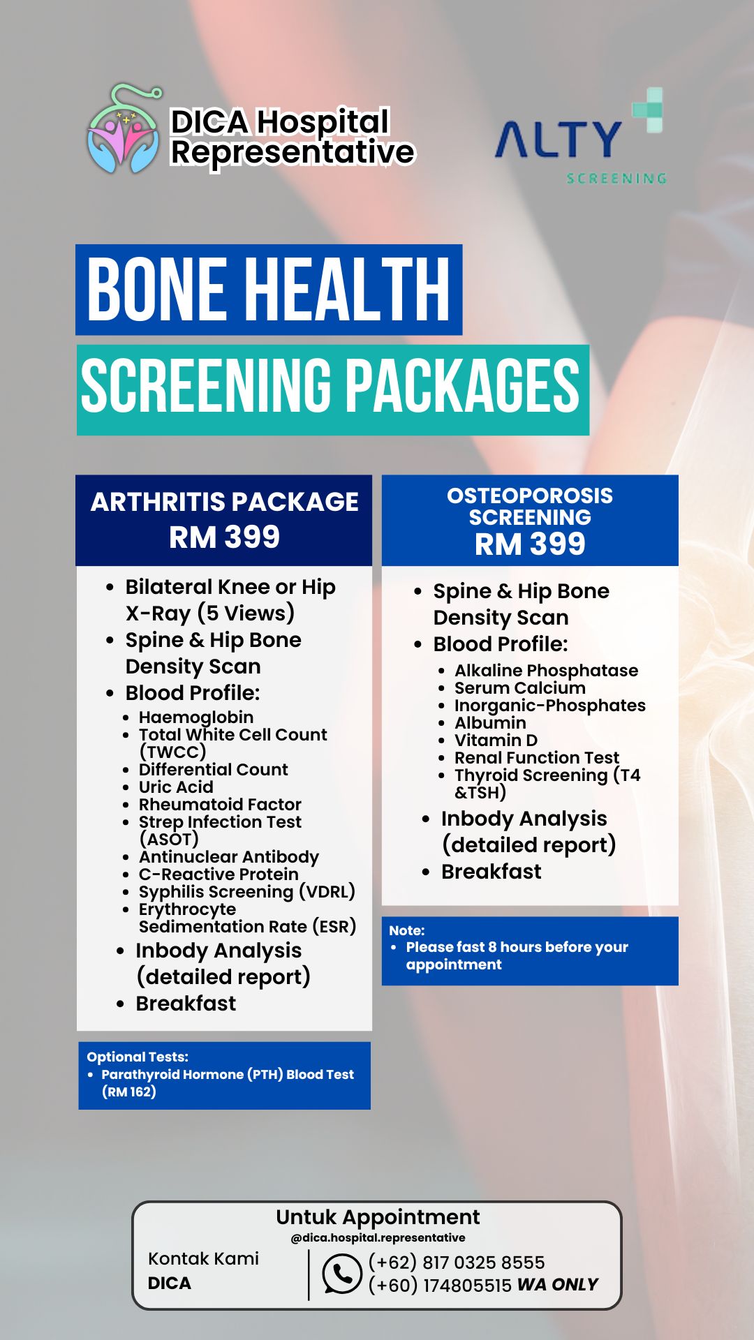 Dapatkan promo paket MCU seharga RM399, dengan beragam pemeriksaan yang didapat. Promo berlaku hingga 31 Desember 2025. Harga dan informasi bisa berubah sewaktu-waktu. Harap hubungi DICA sebelum memesan.