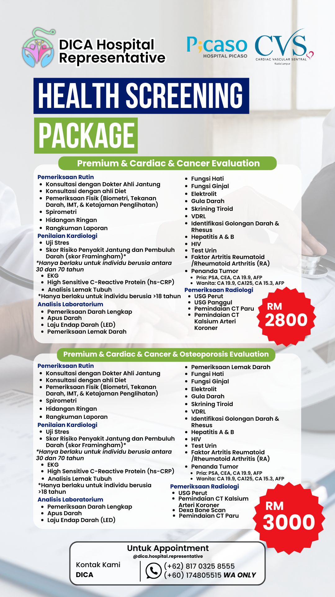Dapatkan promo paket MCU seharga RM2.800, dengan beragam pemeriksaan yang didapat. Promo berlaku hingga 31 Desember 2025. Harga dan informasi bisa berubah sewaktu-waktu. Harap hubungi DICA sebelum memesan.
